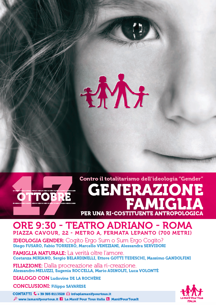 Il 17 ottobre 2015, dalle 09.30 al Teatro Adriano a Roma: "Contro il totalitarismo dell'ideologia "Gender" - Generazione Famiglia - Per una ri-costituente antropologica"